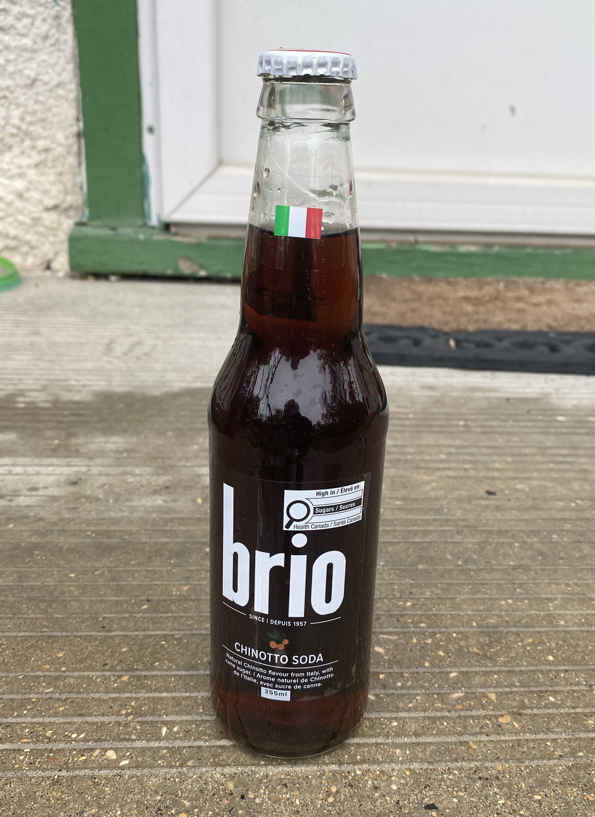 I encountered brio drink in Safeway .. in the international section, but with a maple leaf. It's a Canadian company bottling the product, "Prepared in Canada", since the 50s. "Natural Chinotto flavour from Italy" probably confuses things (the capitalisation of chinotto but not brio confuses me). Chinotto extract, I guess the oranges, comes from Italy. I'm confused by two different bottle designs.