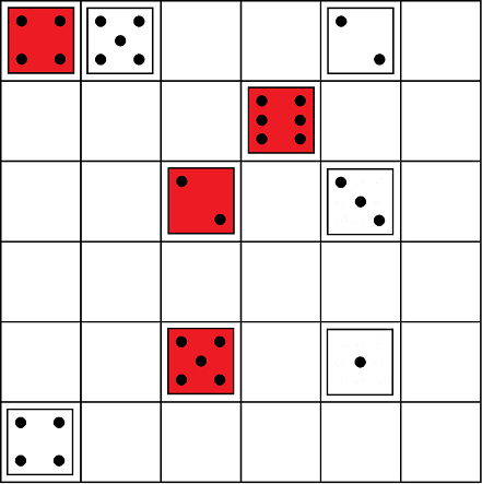 There are two players. One player has six red dice while the other has six white dice. Six dice have numbers 1, 2, 3, 4, 5 or 6 on the top. Dice are not tumbled; the number on top stays on top.