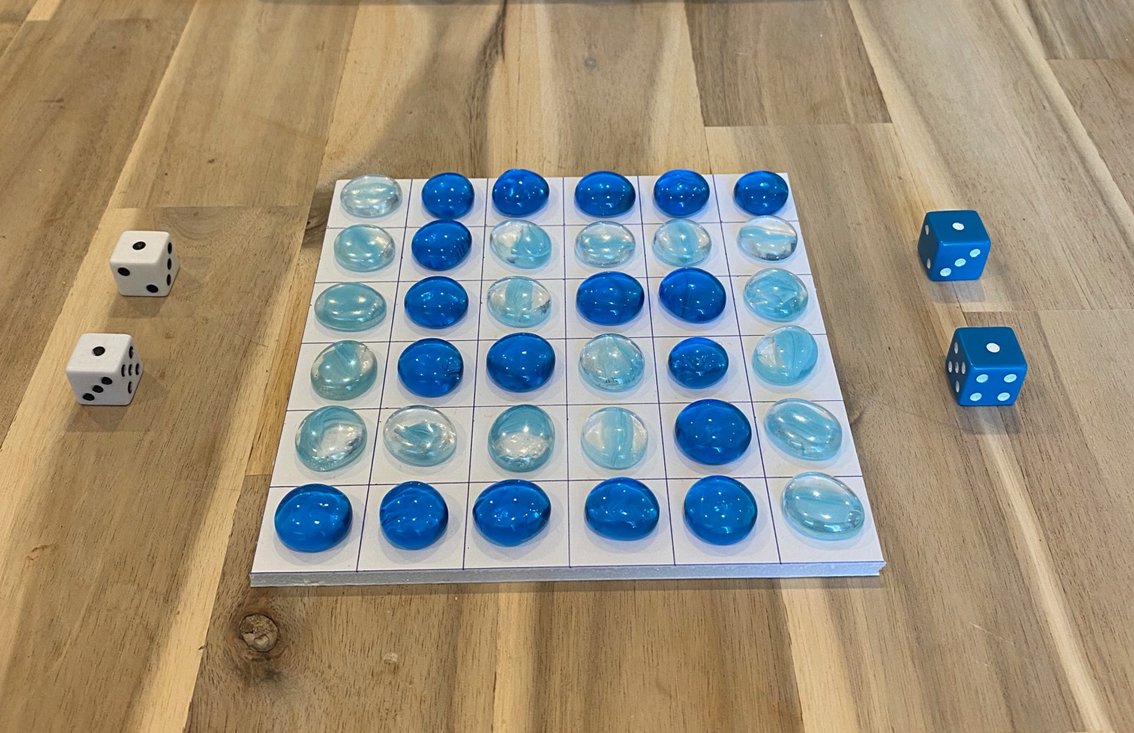 one with the crown, with one of your dice. Once the dice have been placed, the two players take turns making moves.